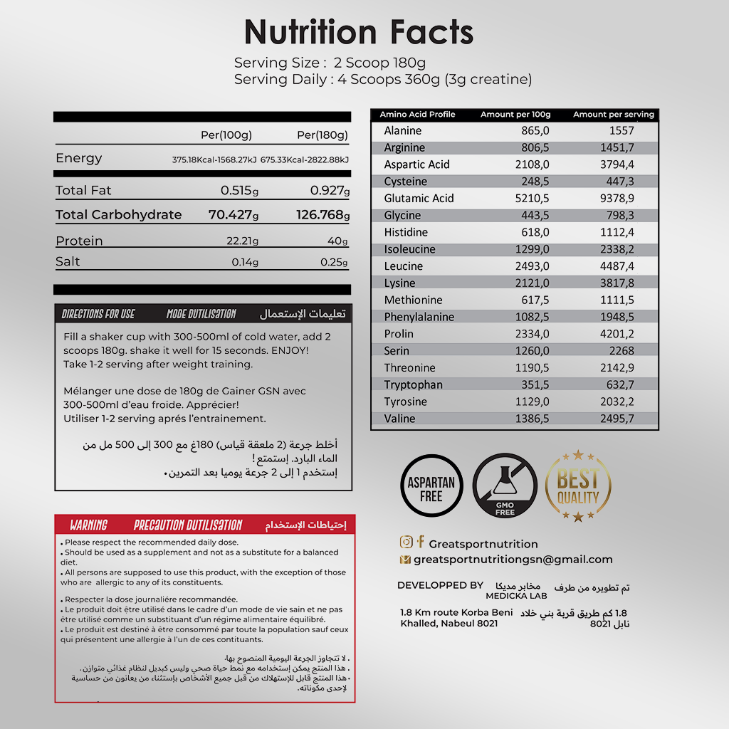 Passez au niveau supérieur avec le GSN Big Mass Gainer 6KG. Ce n'est pas juste un gainer, c'est une formule de précision développée pour transformer votre physique. Chaque dose est un concentré de puissance conçu pour nourrir vos muscles et exploser vos records.